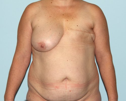 Rekonstrukcija leve dojke z lastnim tkivom s trebuha. Rekonstrukcija bradavice z lokalnim režnjem in tetovaža kolobarja. Dvig desne dojke (periareolarna mastopeksija) za izboljšanje oblike in simetrije.